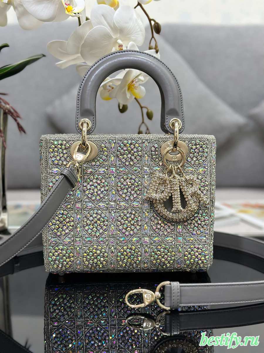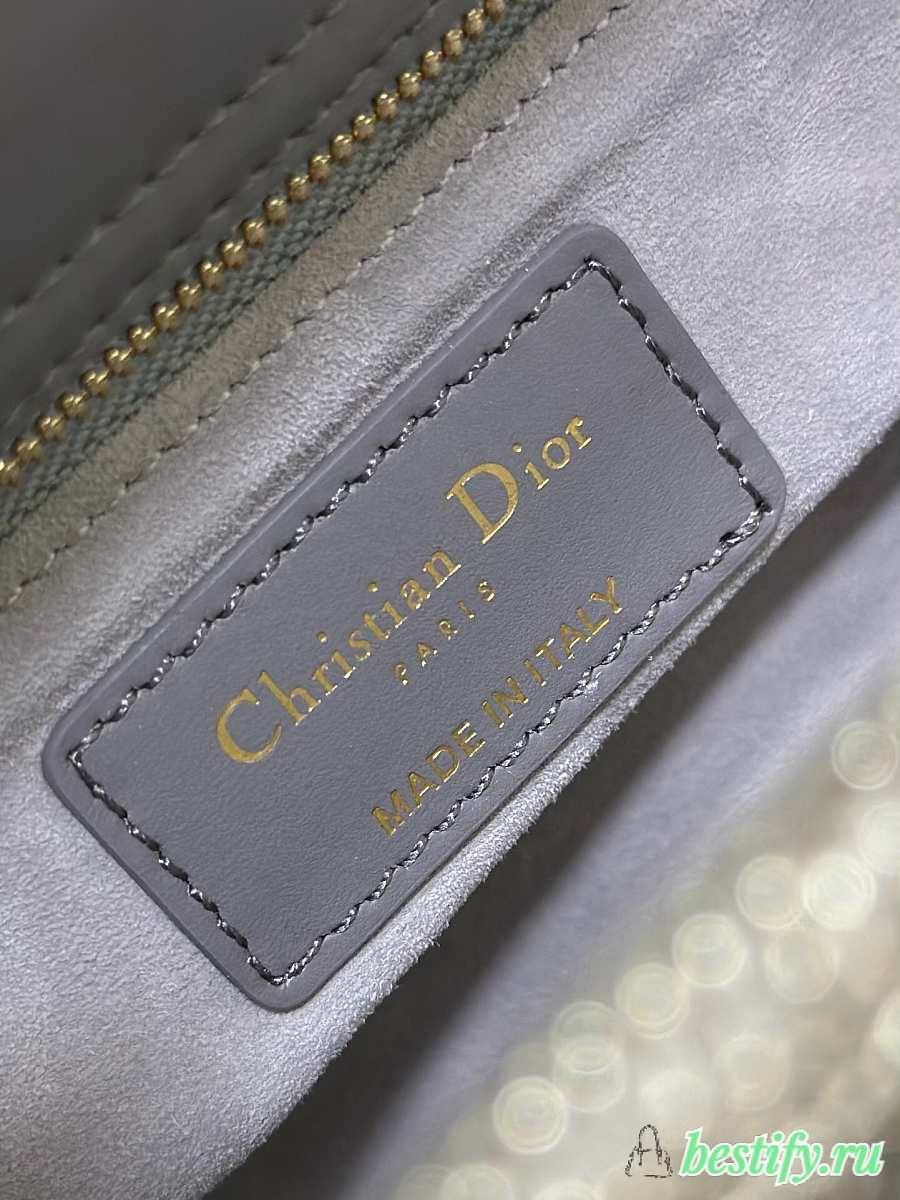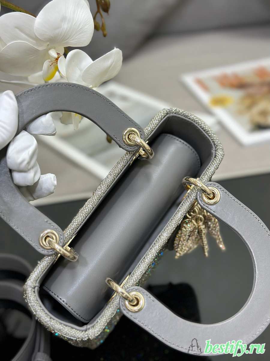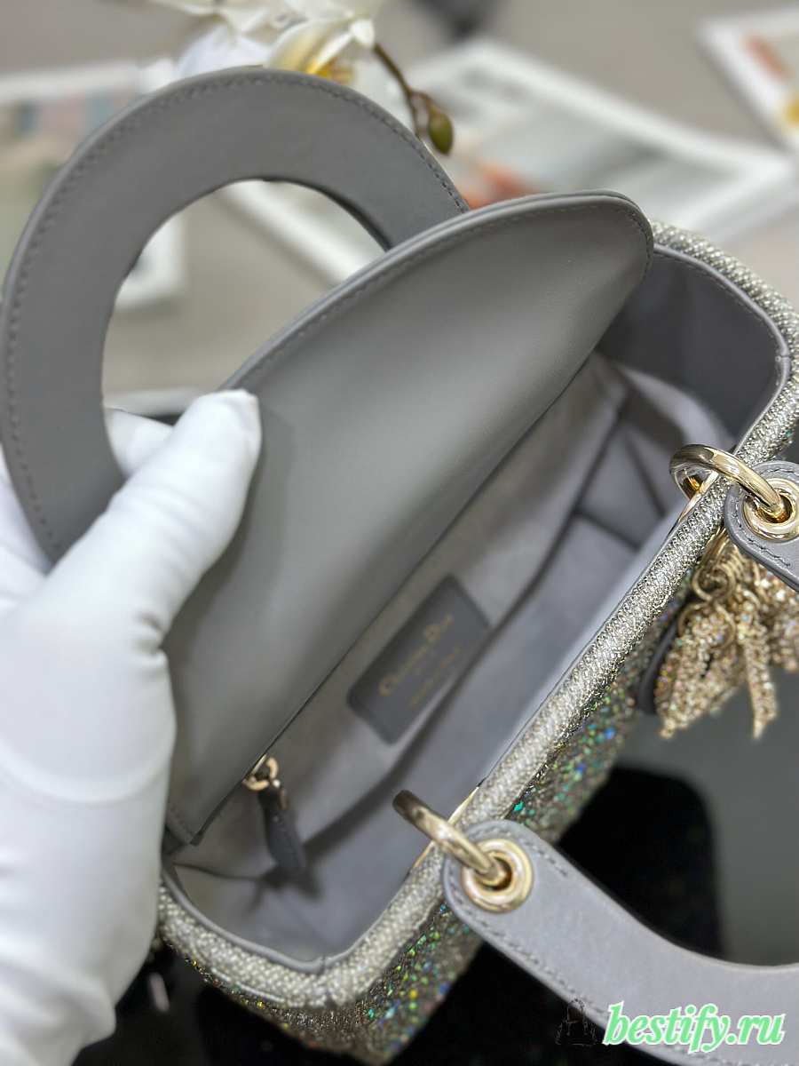 Dior Light Grey Leather and Satin Crystal Embellished Cannage Small Lady Dior Tote - 20x16.5x8cm