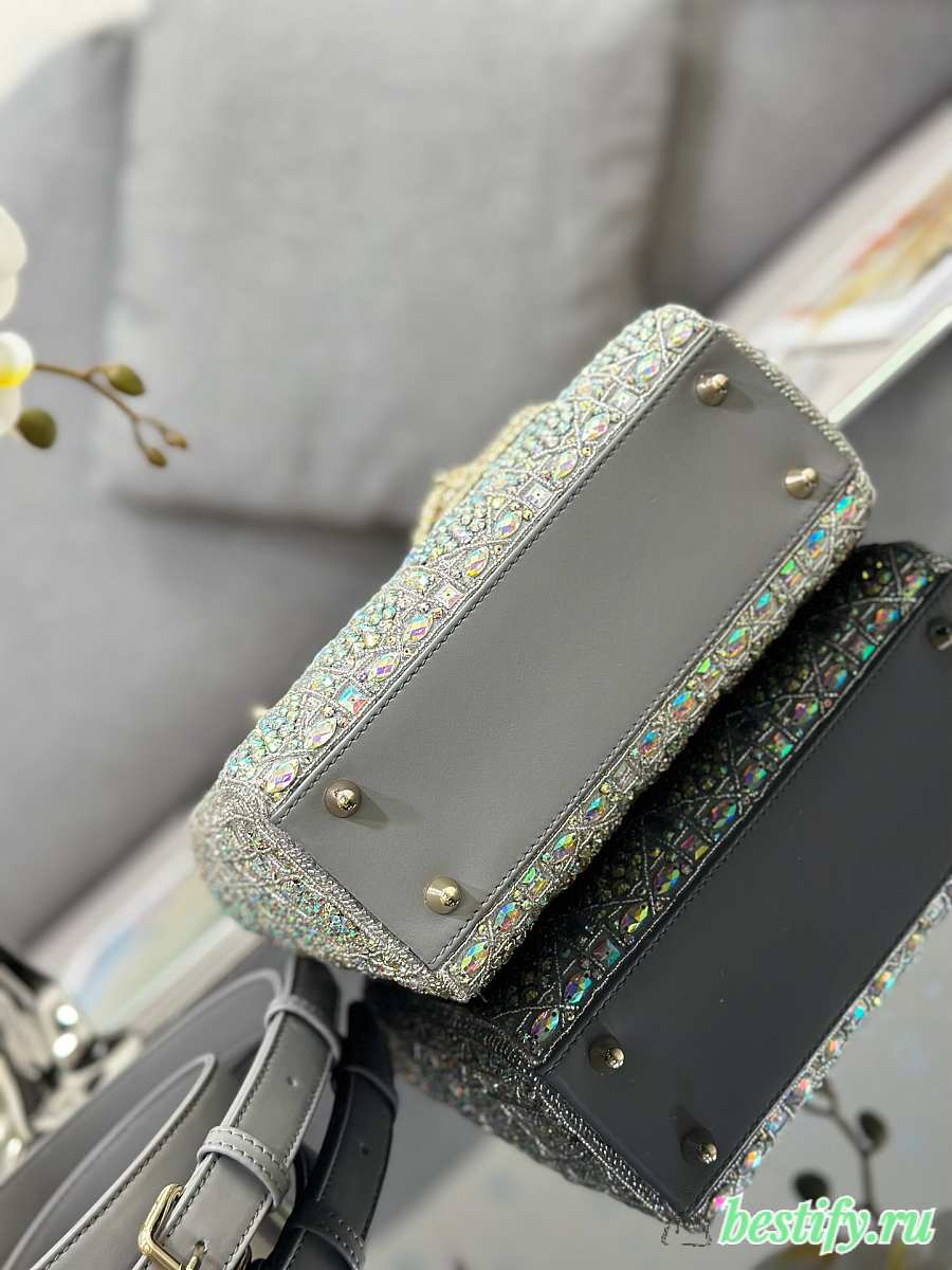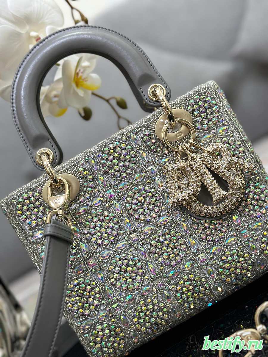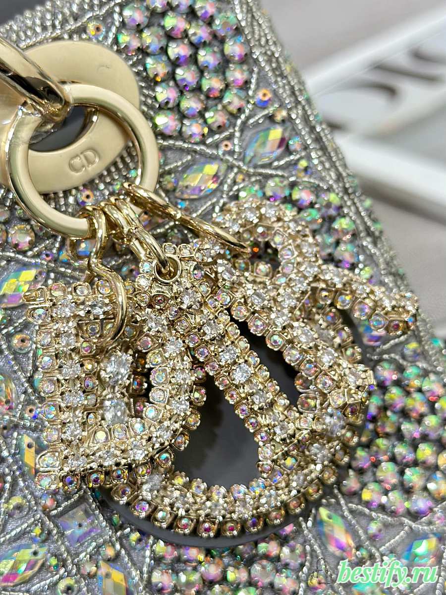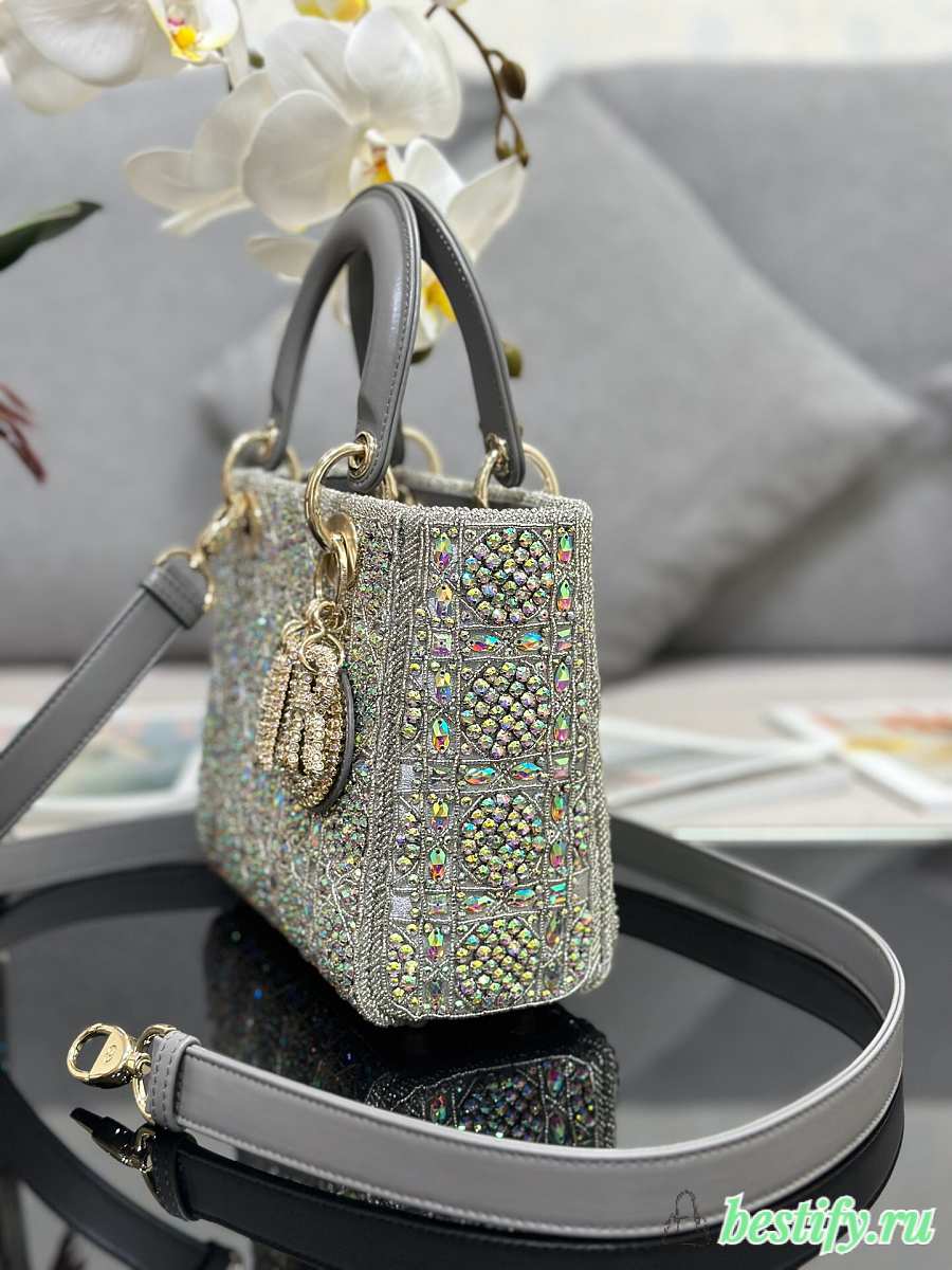 Dior Light Grey Leather and Satin Crystal Embellished Cannage Small Lady Dior Tote - 20x16.5x8cm